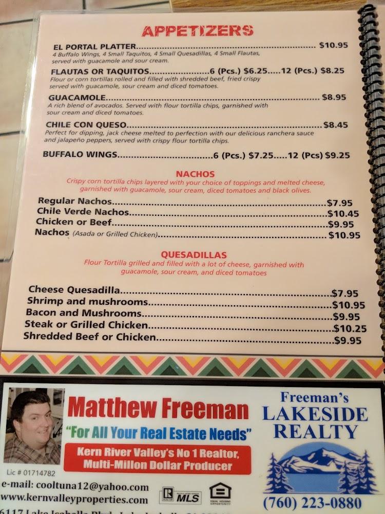 Welcome to El Portal Mexican Grill, your go-to destination for authentic Mexican cuisine in Lake Isabella. Located at 12598 Mountain Mesa Rd, we offer a relaxed and welcoming atmosphere perfect for solo diners and groups alike. Enjoy a delicious range of traditional dishes, complemented by an impressive selection of local beers and fine wines. With options for dine-in, takeout, and delivery, we cater to every craving. Our accessible facilities ensure everyone can savor our meals, and our fast service means you won't wait long for your favorites. Join us for lunch or dinner and experience a taste of Mexico!