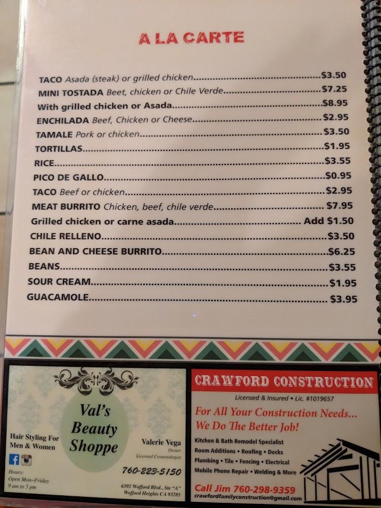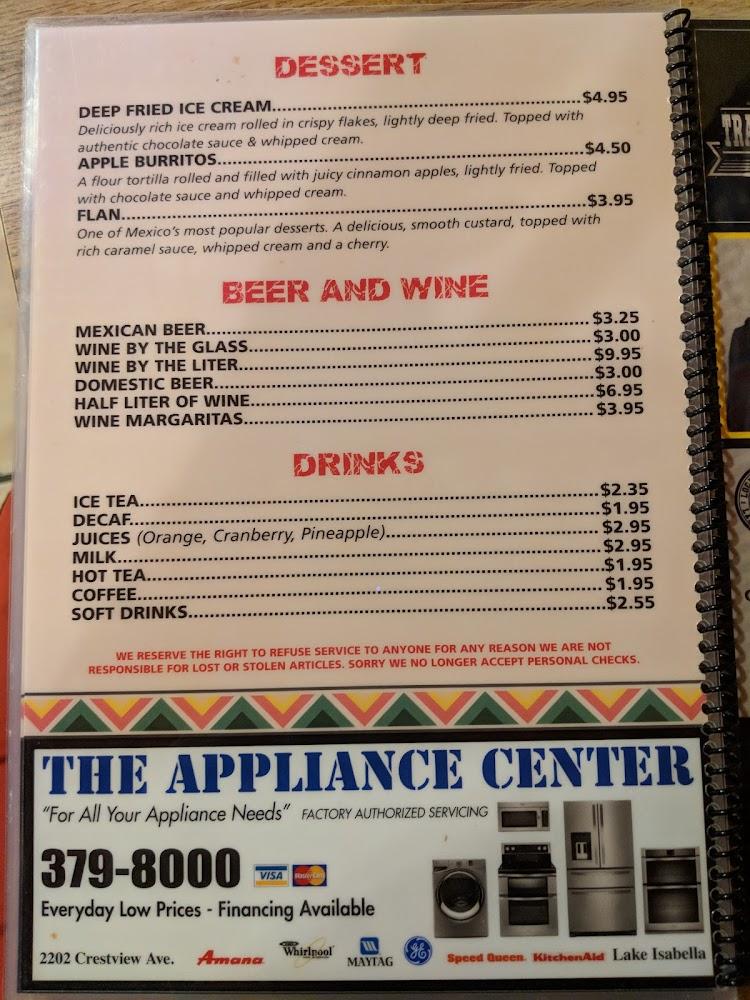 Beer and wine selections complement the menu, offering a taste of Mexico to accompany meals. Guests can indulge in hearty burritos or lighter fare like salads. Desserts like flan and deep-fried ice cream provide a sweet conclusion to a flavorful experience.